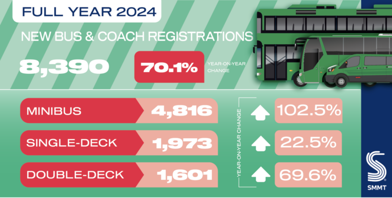 Continuing its challenging market recovery with strong growth, there was a 70% year-on-year increase in registrations across all segments, which saw a total of 8,390 buses, coaches and minibuses entering service in 2024, reflecting positive operator confidence in bus patronage, as well as the use of government funding in support of the acquisition of new zero emission vehicles.